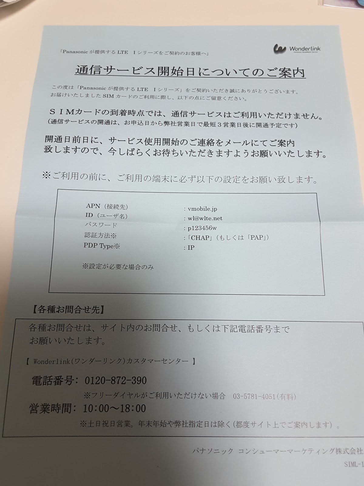ここのSIMは開通手続きを始めた時から契約開始ではなく、SIMカードを注文して、Panasonicが指定した日から契約開始のようです。